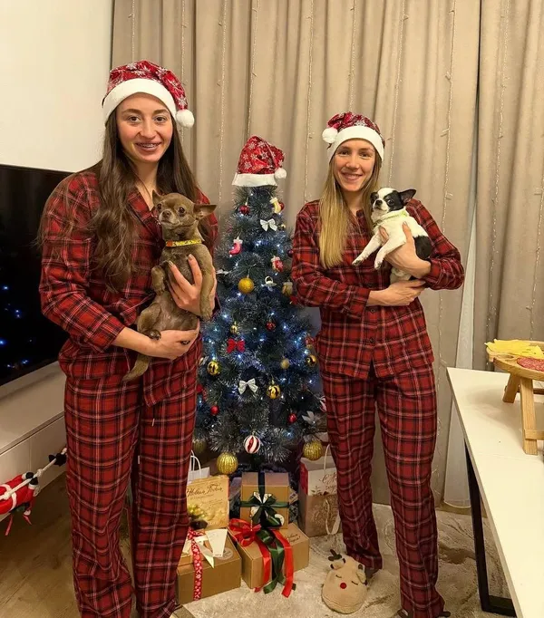 Биатлонистки Анастасия и НаталияШевченко встретили новый год с близкими и своими питомцами. Вместо праздничных нарядов они выбрали одинаковые красные пижамы и колпаки.