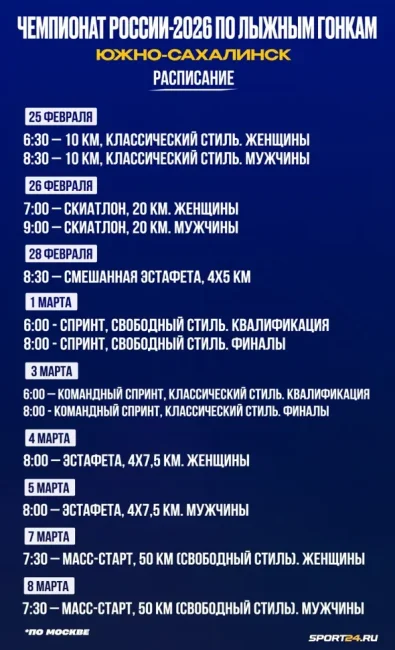 Гид по чемпионату России.С 25 февраля по 8 марта 2026 года у топ-лыжников, которые не получили нейтральный статус для участия в международных стартах, и всех остальных состоится главный старт сезона — чемпионат России. Место проведения было выбрано новое, причем максимально необычное, — Южно-Сахалинск. Много споров это решение федерации вызывало еще в межсезонье, так как это максимально далеко, временная разница даже с центром России — значительная. Тем не менее никто переносить турнир в другое место не стал. Все спортсмены прилетели на Дальний Восток. Sport24 перед стартом соревнования собрал все, что нужно знать о ЧР-2026. Место проведения Южно-Сахалинск когда-то принадлежал Японии. Он расположен в южной части острова Сахалина (отсюда и название города), на реке Сусуя. Было время, когда там жило несколько десятков ссыльных, а теперь его население — 181 976 человек. Разница во времени с Москвой составляет 8 часов. В городе переплетаются японские, советские и российские черты. От природных красот невозможно оторвать глаз. Лето там комфортное, а зима идеально подходит сноубордистам и горнолыжникам. Добыча нефти и газа является важной частью экономики региона. В Южно-Сахалинске не только популярно гонять на сноуборде или горных лыжах. Играют в футбол, хоккей, занимаются биатлоном, тхэквондо, легкой атлетикой и другими видами спорта. Теперь вот и лыжные гонки добрались до региона. shutterstock.com Расписание соревнований Гонки в Южно-Сахалинске запланированы с 25 февраля по 8 марта. Программа будет классической для мировых лыжных гонок : мужчины и женщины побегут равные дистанции. Sport24 Показ Все гонки можно будет посмотреть в прямом эфире на «Матч ТВ». Единственный минус — время. Вставать ради того, чтобы насладиться турниром, придется максимально рано. Кто не придет на ЧР-2026? Некоторых лыжников национальный чемпионат не досчитается. В Южно-Сахалинске точно не будет Дарьи Непряевой и Савелия Коростелева . Они после Олимпиады-2026 едут в Швецию, где примут участие в очередном для себя этапе Кубка мира. По состоянию здоровья пропустит старт Анастасия Кулешова . Не приедет соревноваться и олимпийский чемпион Сергей Устюгов . РИА Новости Главные интриги ЧР-2026 В нынешнем сезоне у олимпийского чемпиона Александра Большунова всего две победы и два серебра в дистанционных гонках. Он явно не в лучшей форме, а его психологическое состояние вызывает вопросики. Все же Олимпиаду-2026, несмотря на попытку получить нейтральный статус и добиться своего возвращения через суд, Сан Саныч пропустил. К ЧР лыжник не подходит в статусе фаворита, однако будет интересно увидеть, как за время паузы он подготовил себя к соревнованиям в Южно-Сахалинске. Перед турниром Александр успел отметиться победой в классическом масс-старте на 30 км на «Сахалинском марафоне». Большунов напомнил о себе не только этой викторией, но и резким высказыванием о происходящем на Олимпиаде. Гонки в Валь-ди-Фиемме он назвал цирком. Несолидно будет трехкратному олимпийскому чемпиону после такого поджигания опозориться на чемпионате России… Фанаты ждут как минимум двух побед в личных гонках.