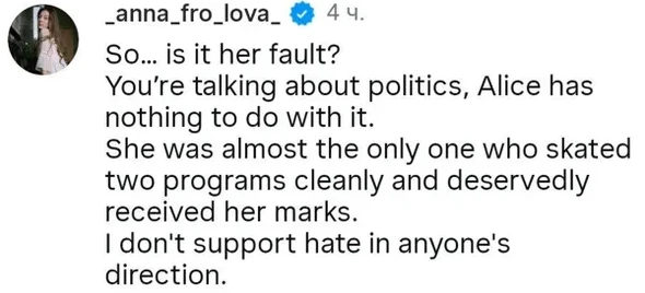 «Разве это ее вина? Вы говорите о политике, но Алиса тут ни при чем. Она была чуть ли не единственной, кто чисто откатал две программы, и заслуженно получила свои оценки. Я не поддерживаю ненависть в чью бы то ни было сторону», — написала Фролова.