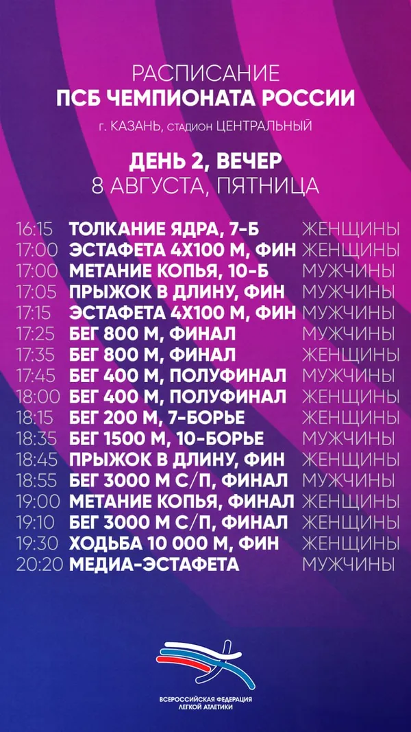 Расписание вечерней сессии третьего дня чемпионата России по легкой атлетике размещено ниже: