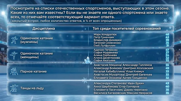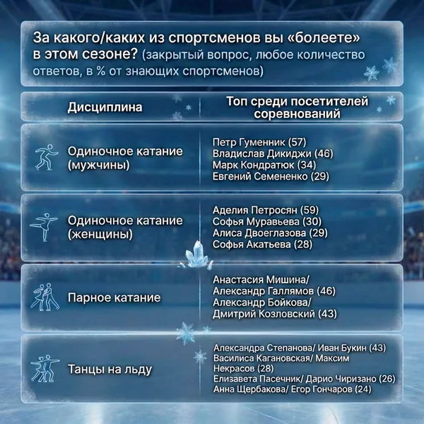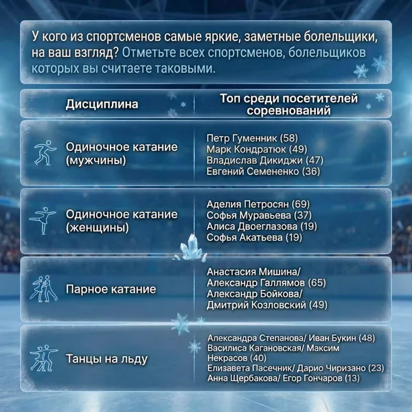 При этом «яркость» болельщиков воспринимается куда шире, чем формальное членство: по мнению зрителей, наиболее заметная поддержка у Петросян (69%), Мишиной/Галлямова (65%), Гуменника (58%). В танцах на льду выделяются болельщики дуэта Степанова/Букин (48%), хотя в фан-клубах состоят лишь 4% — то есть их «видимая» фан-база намного шире «официальной».