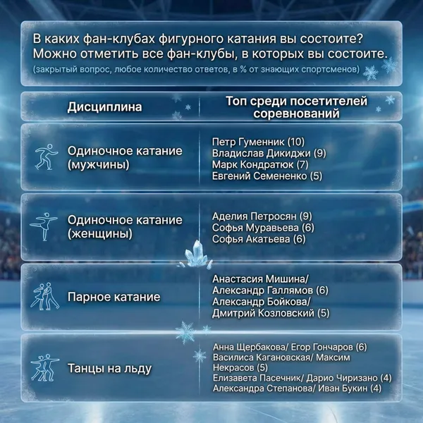 Фан-движение в фигурномкатании заметно, но остается нишевым: в фан-клубах состоят единицы — до 10% среди тех, кто знает спортсменов. Относительной популярностью пользуются фан-клубы ПетраГуменника (10%), ВладиславаДикиджи (9%) и АделииПетросян (9%). В парном катании наибольшее количество человек состоят в фан-клубе дуэта Мишина/Галлямов (6%), в танцах на льду в лидерах фан-клуб Щербаковой/Гончарова (6%).