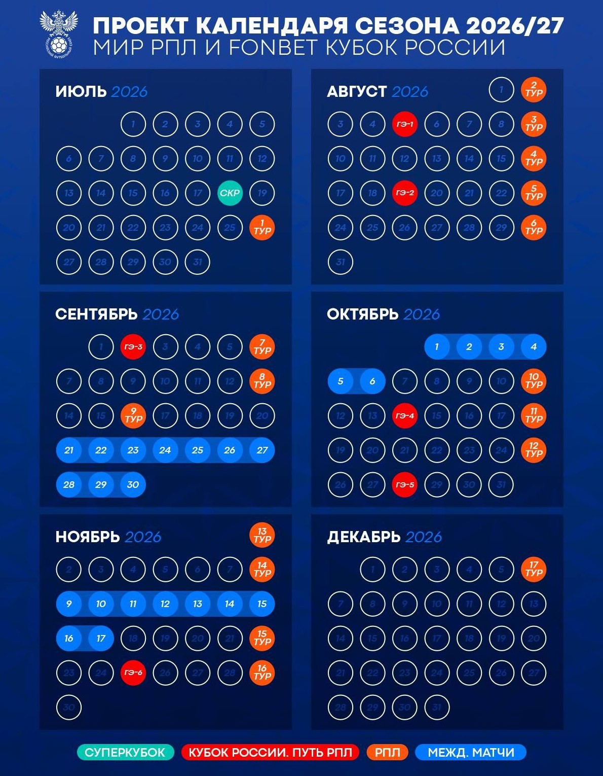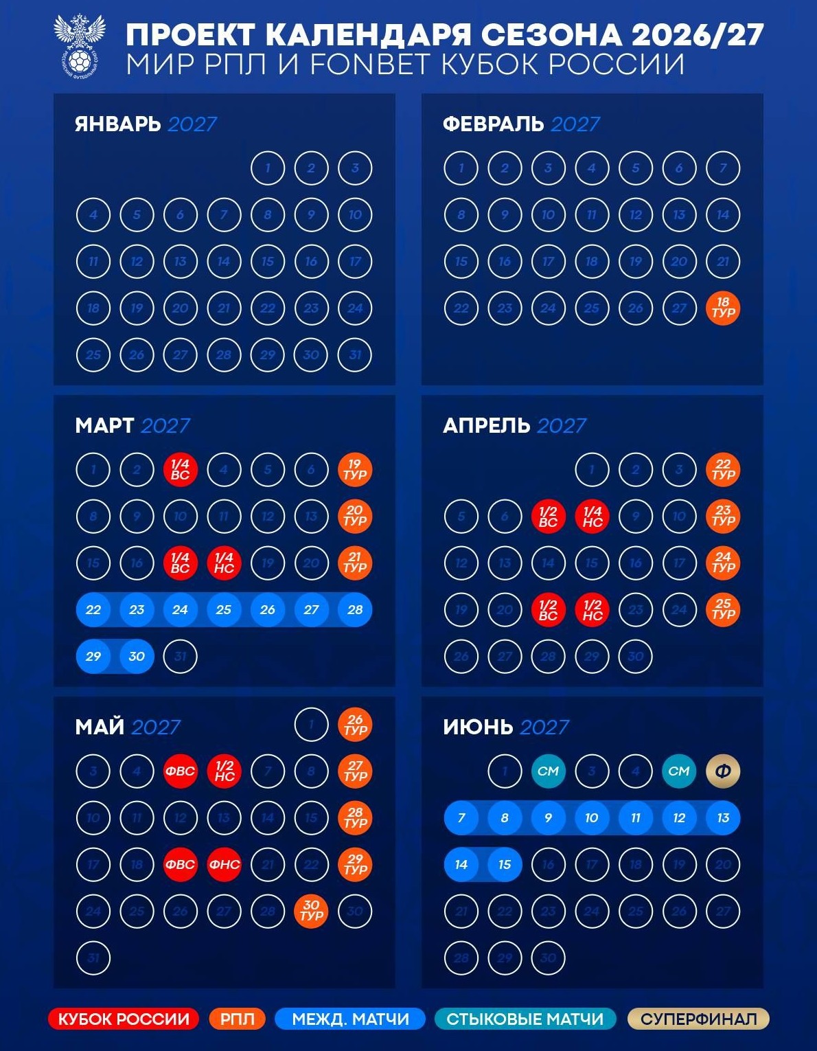 Бюро исполкома Российского футбольного союза утвердило график сезона-2026/2027, сообщает пресс-служба организации в телеграм-канале. Так, новый сезон начнётся с матча за Суперкубок России, который состоится 18 июля 2026 года. 26 июля стартует Мир Российская Премьер-Лига, а 6 июня 2027 года пройдёт Суперфинал Фонбет Кубка России по футболу. alt=